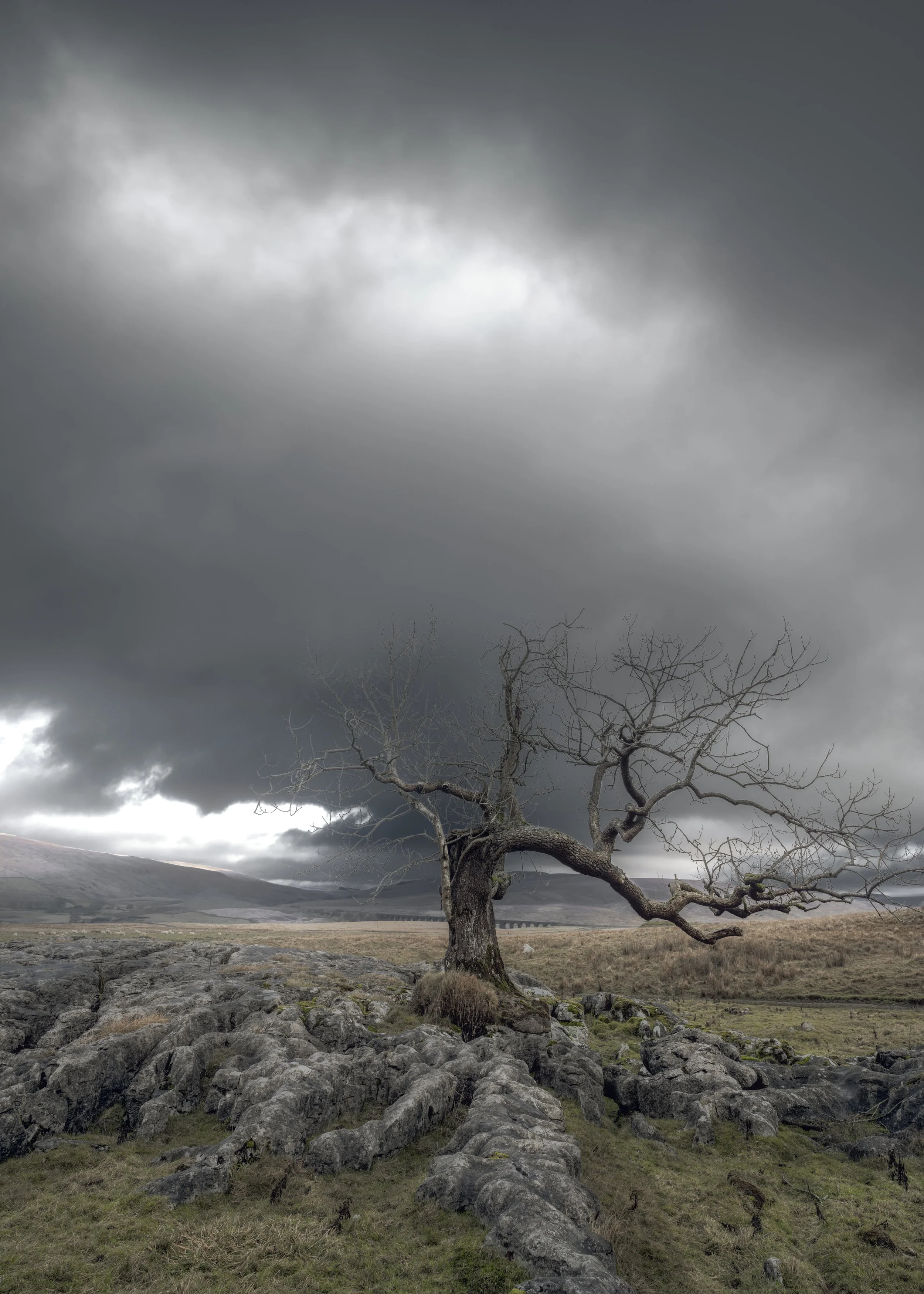 A lone, windswept tree clings to life on the rugged limestone pavement of Winskill Stones. The black and white convertion deepens the drama—heavy clouds and almost surreal light. It’s a portrait of isolation and endurance in a wild, unforgiving landscape.
